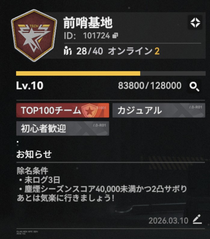 ガチではなくカジュアルにデイリーやイベストなどを楽しみたい人募集中事前説明なしの未ログイン1週間で除名対象基本ノルマなしで前線はフルAUTOでもokDiscordはなしもし聞きたいこととかあれば記載す...