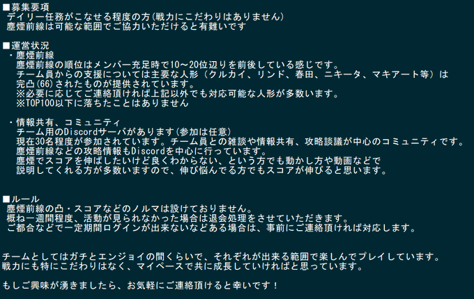 塵煙前線の情報の共有につきましては、一方的ではありますが私が個人的にまとめているスプシを参照していただければ幸いです。