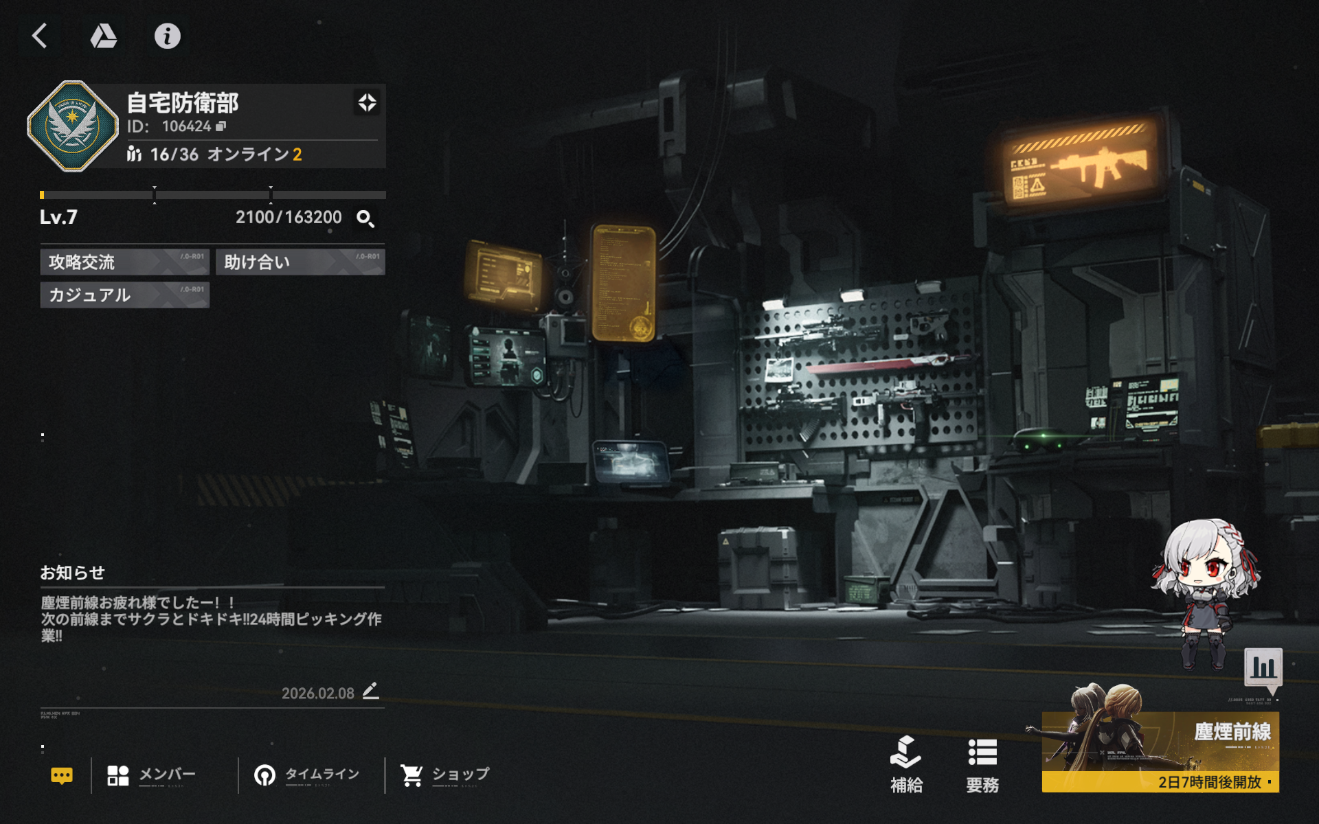 塵煙前線では10位以内をうろちょろしてます。ノルマは厳しめです(塵煙前線手動3凸/デイリー要務)。ドルフロ2を頑張ってみたい方大歓迎です!まだまだ先ですが、チーム対抗のイベントにも注力したいと考えてい...