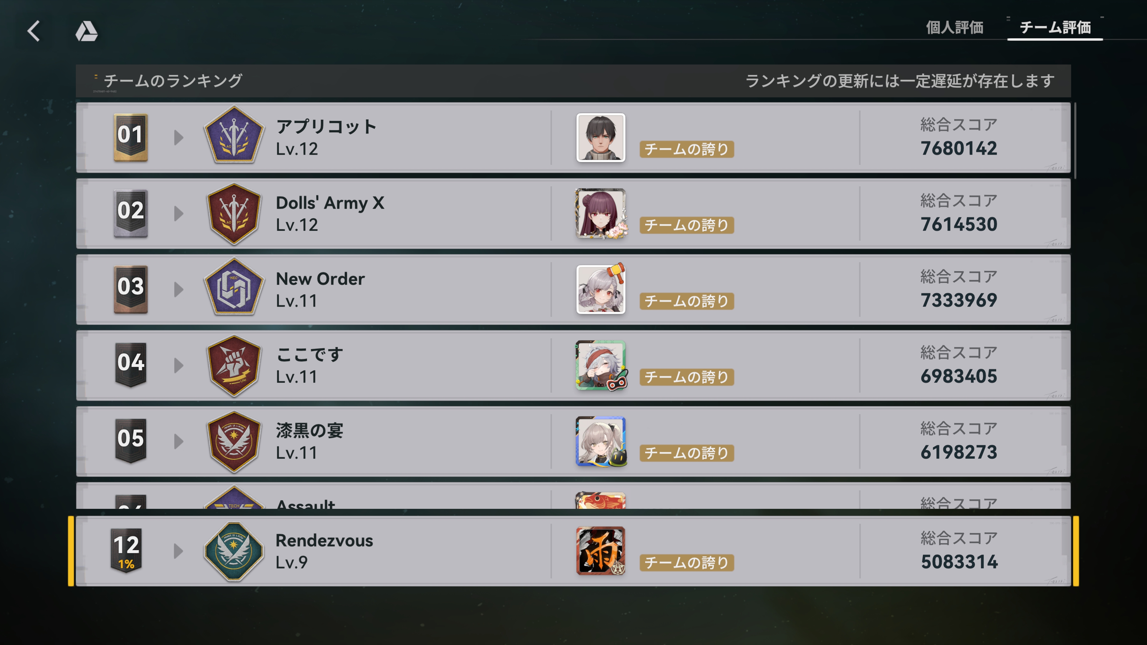 縛りのないカジュアルな環境下ですが、現メンバーは皆キッチリこなすアクティブなチームです。23期塵煙前線はチームLv9で12位を記録しています。