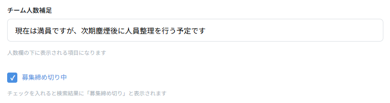 「募集締め切り中」のチェックボックスをONにして保存することで、募集を締め切っている旨を表示できます。