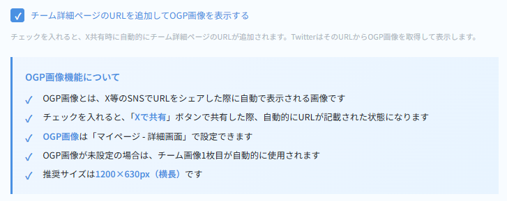 その上で「マイページ>概要」の「X共有テキスト編集」内の「チーム詳細ページのURLを追加して~」にチェックを入れてください。