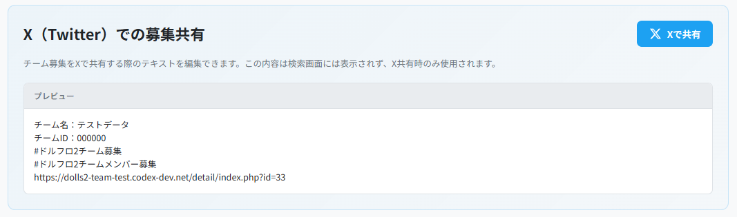これらの設定を行うと、X共有プレビュー画面にチーム詳細ページのURLが追加され、Xで共有した際にOGP画像が表示されるようになります。