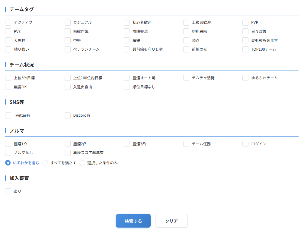 ノルマにある「選択した条件のみ」を選択した場合、選択した条件のみを満たすチームが検索されます。