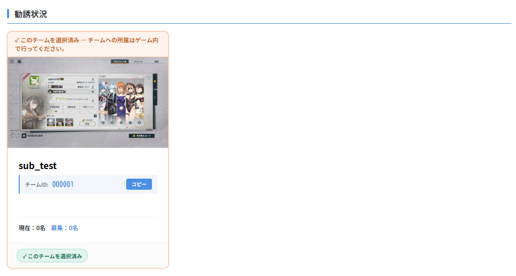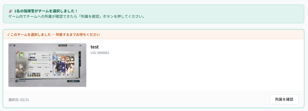 指揮官がゲーム内でチームに所属したことを確認したら、「所属を確認」ボタンを押してください。