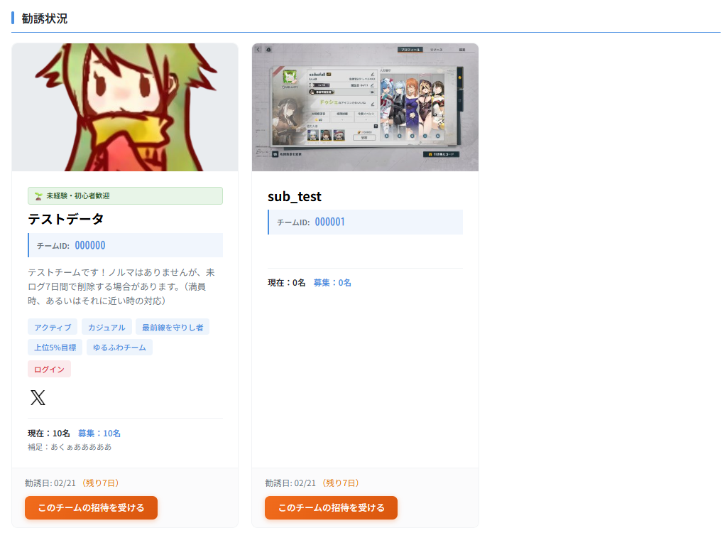 マイページに行くと勧誘チーム一覧が表示されますので、気に入ったチームがあれば「招待を受ける」ボタンを押してください。
