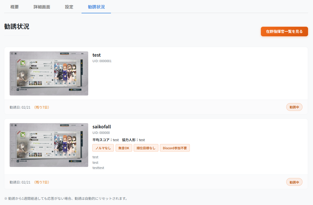 指揮官側が勧誘を受けると、ステータスが「勧誘済み」に変わります。
