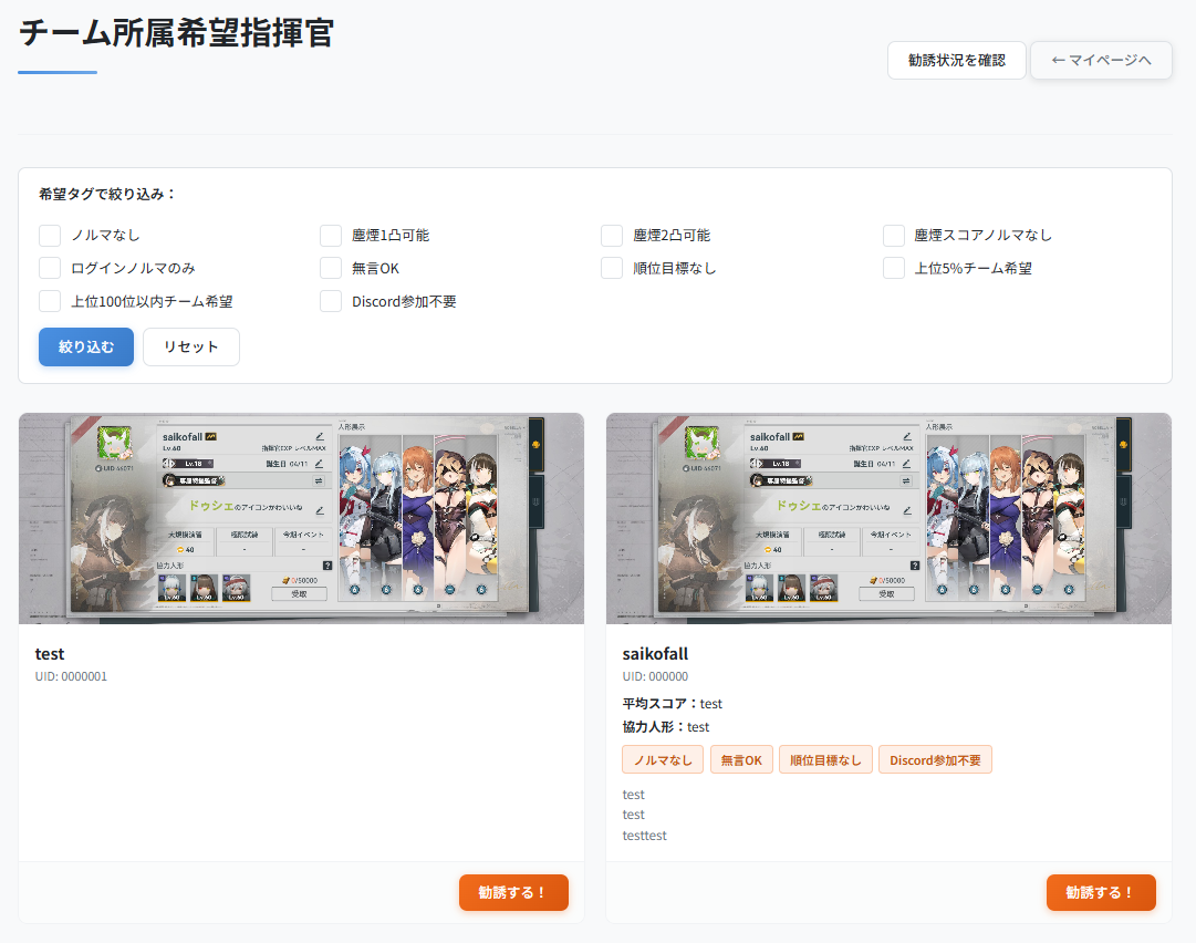 マイページの「勧誘状況」タブ、あるいは右上メニュー内の「チーム所属希望指揮官」からページへ移動できます。